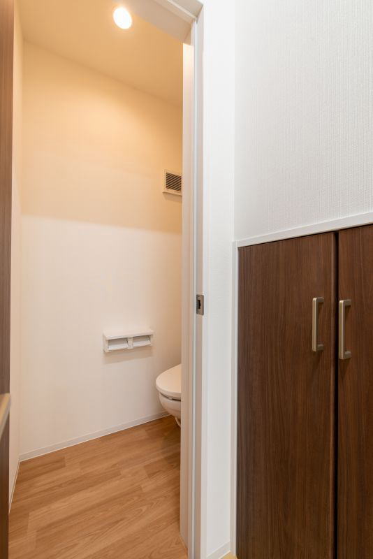 トイレ室の床表面材は耐尿性など通常よりも耐性のある最新の機能性長尺シートを導入